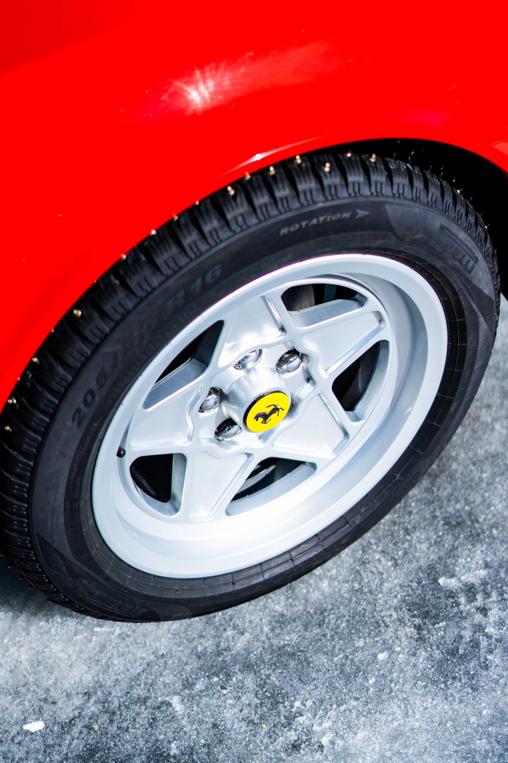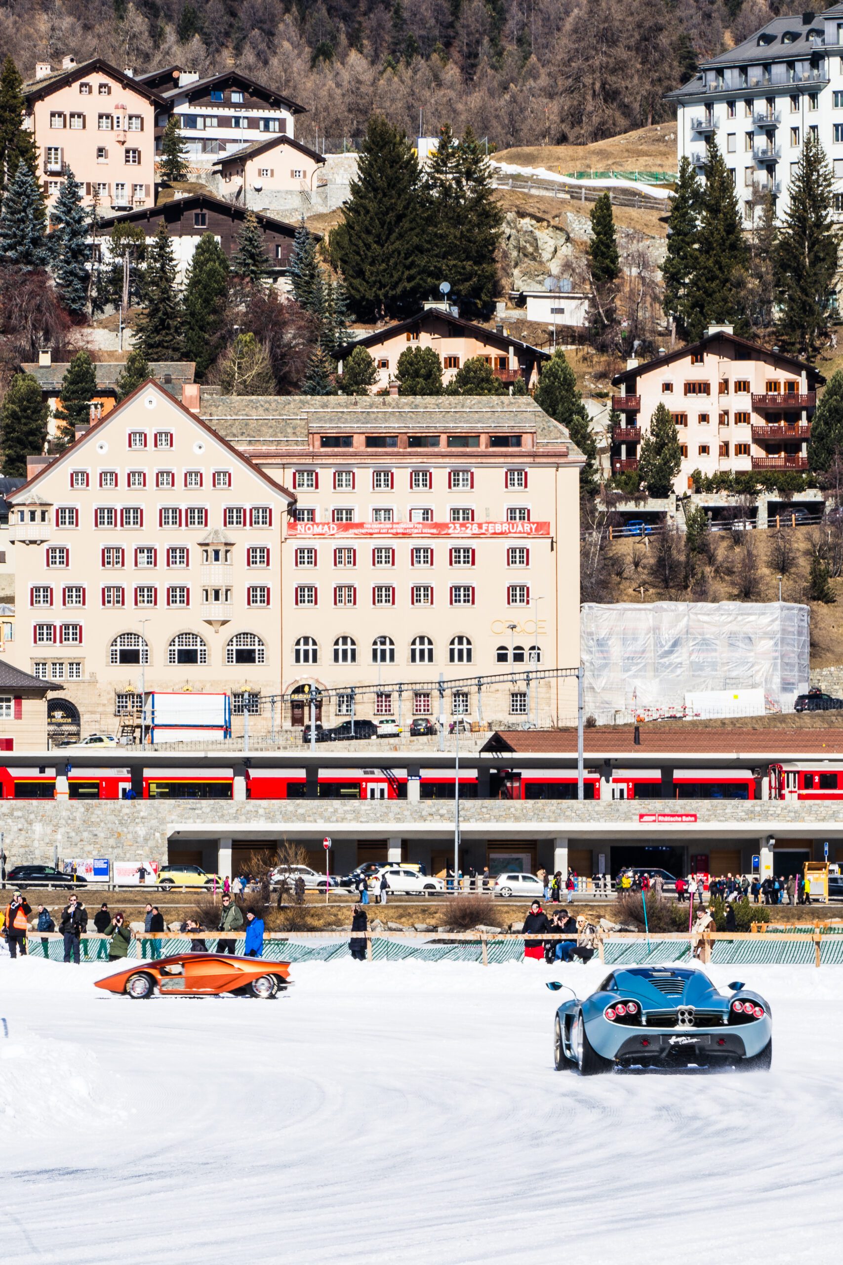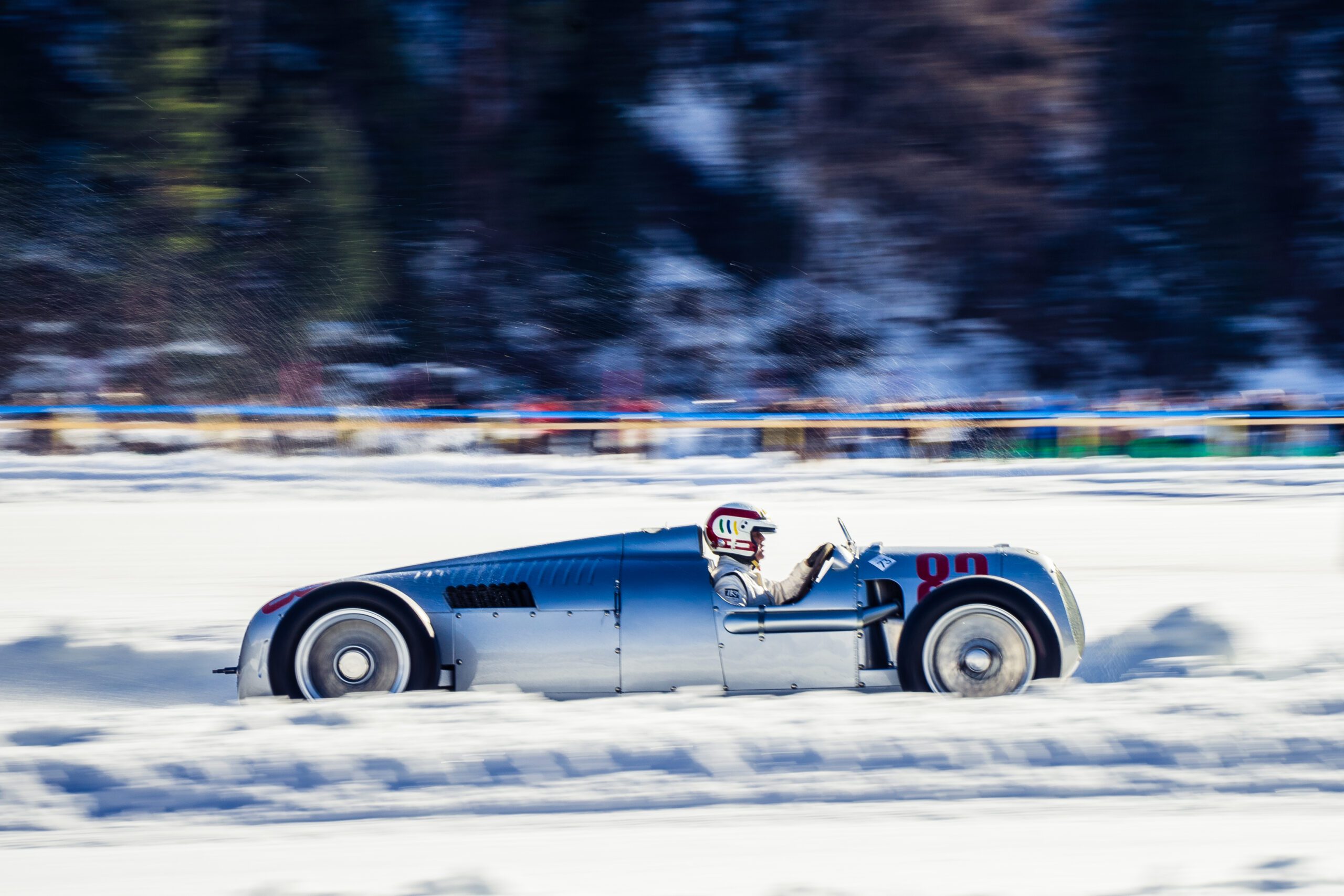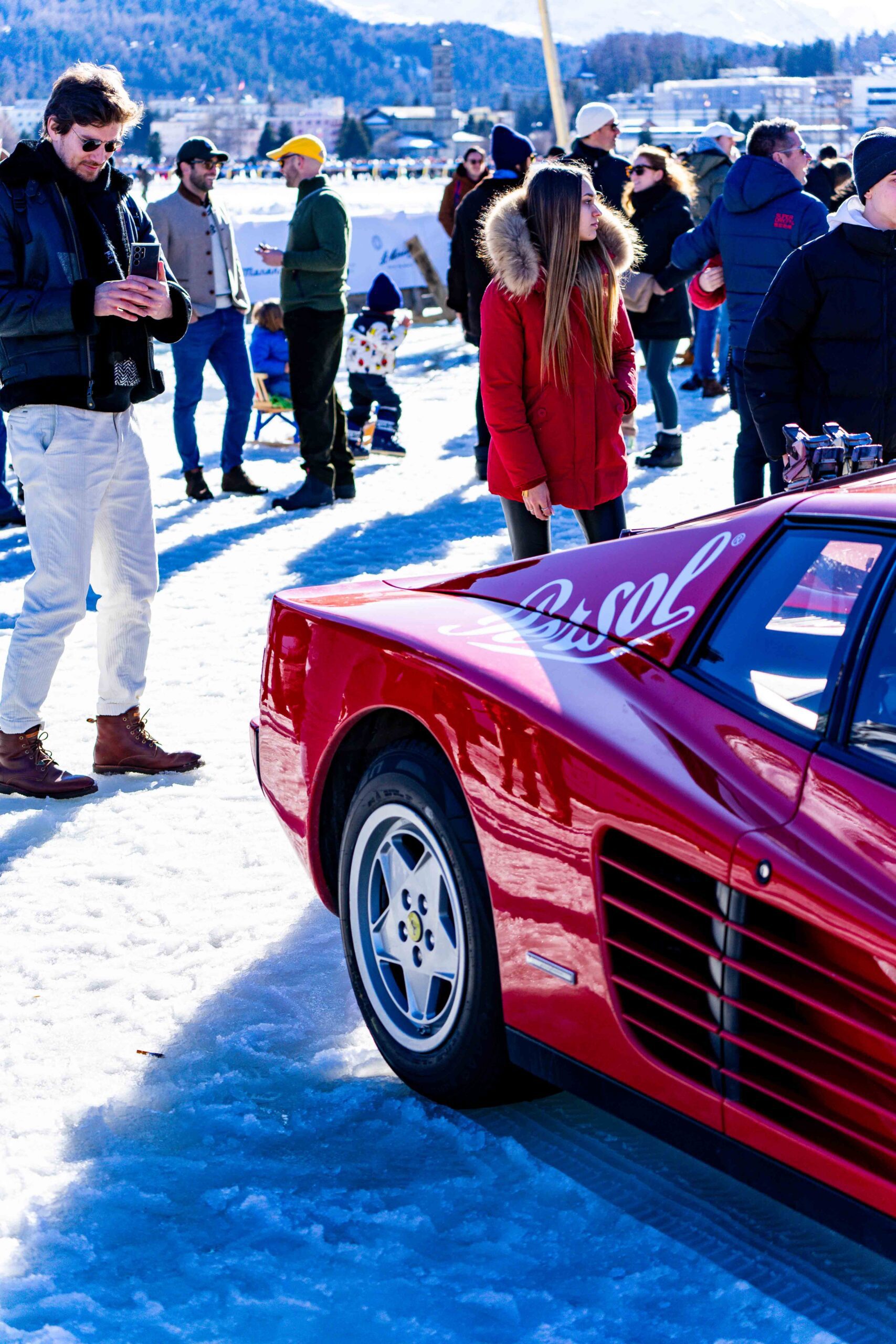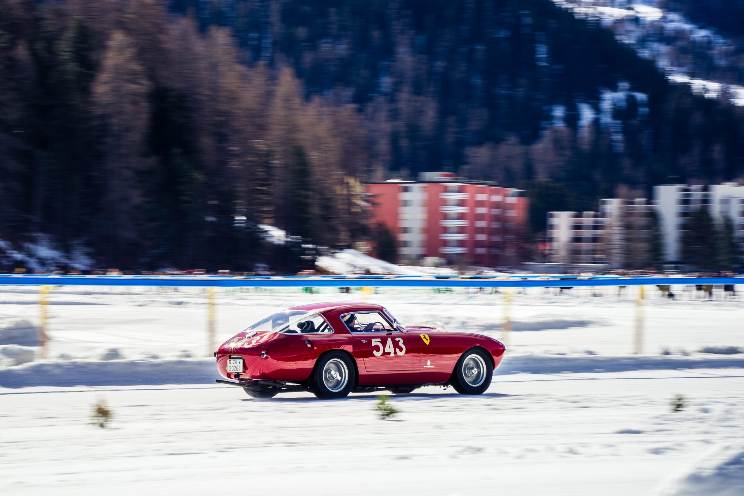Silver vintage Ferrari with wooden skis on the roof rack, driving on ice at The I.C.E. St. Moritz 2023