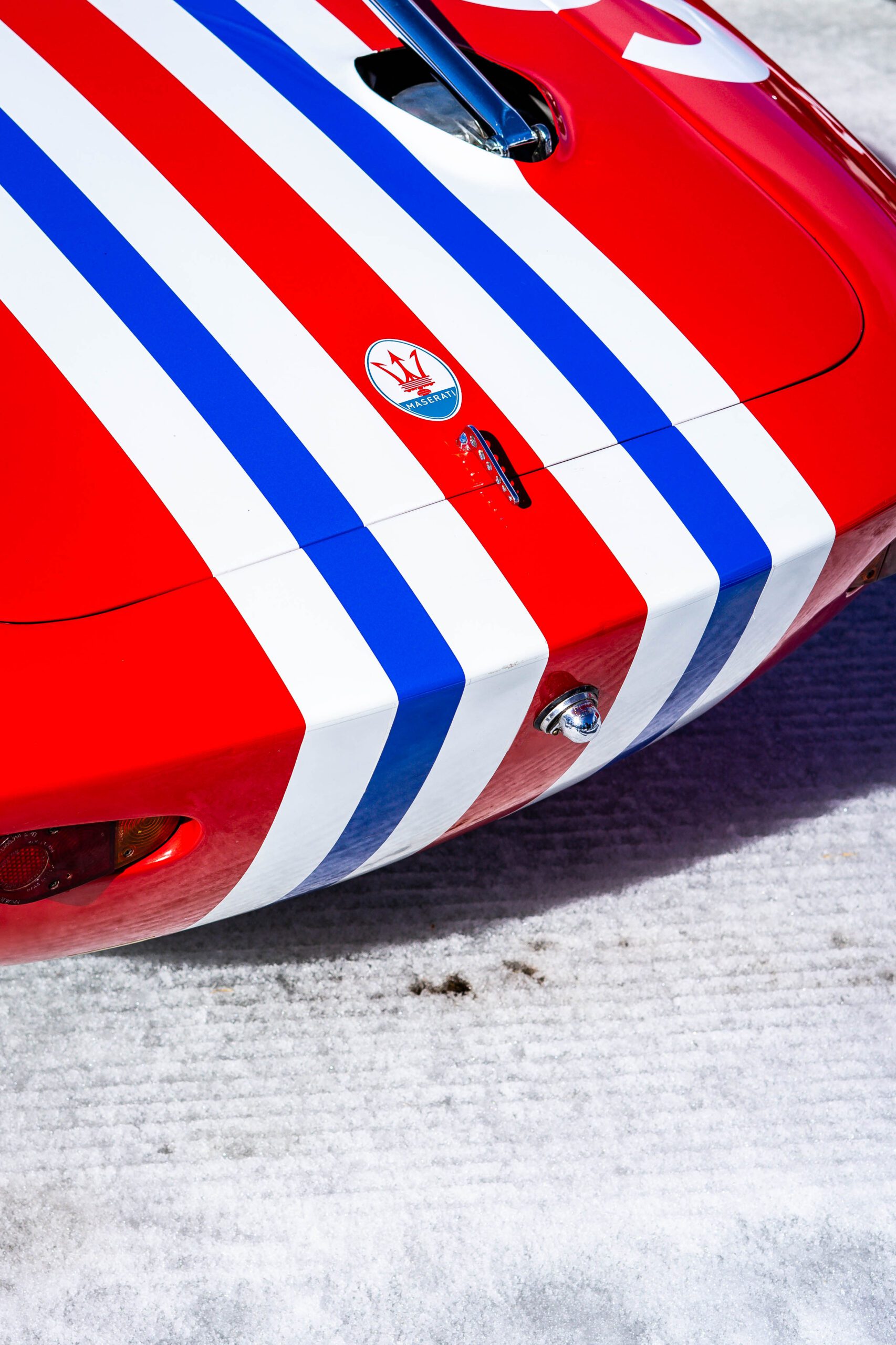 Red vintage race car in motion on a snowy track at The I.C.E. St. Moritz 2023, showcasing classic automotive elegance