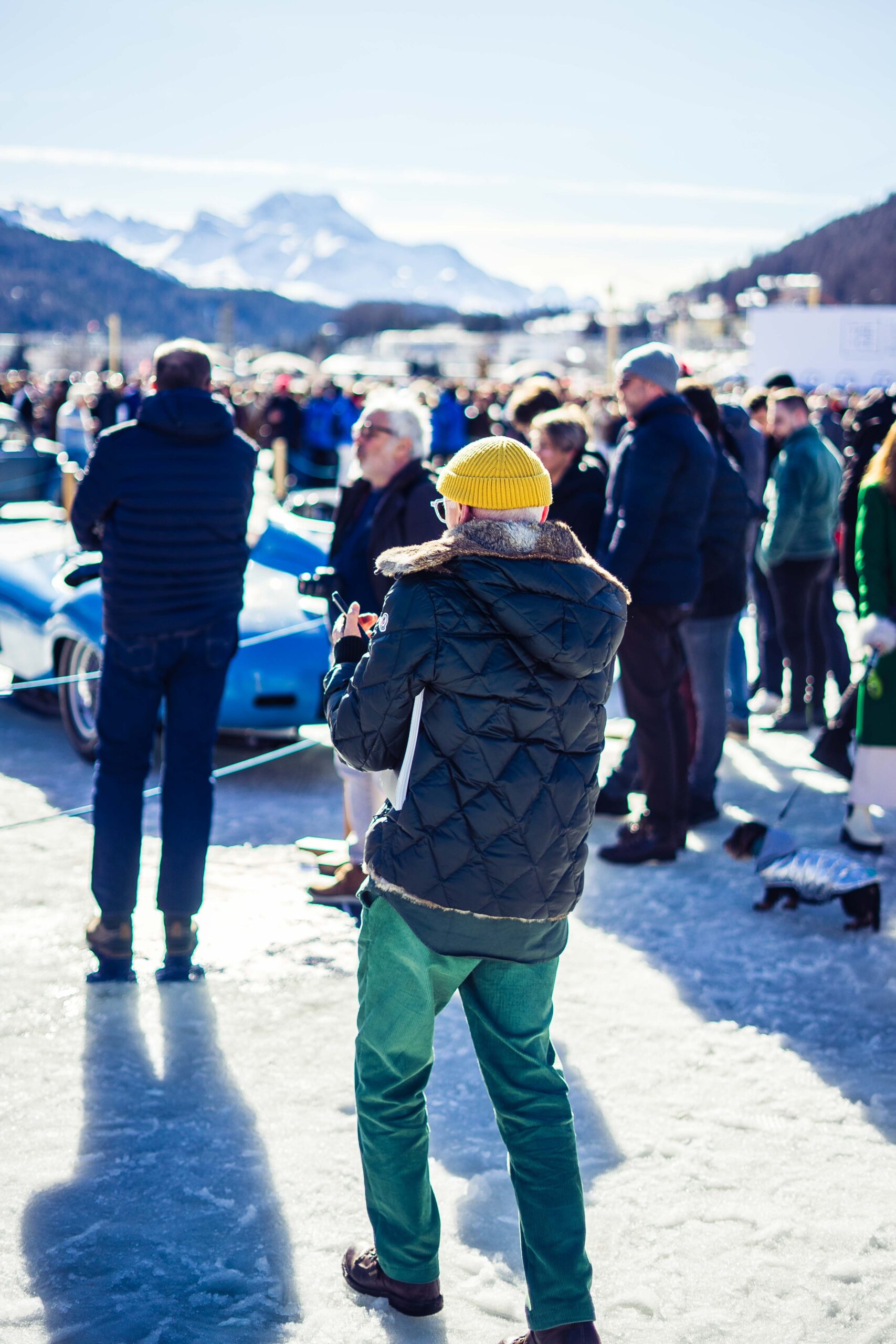 Driver wearing vintage goggles and leather jacket in a red classic race car, surrounded by spectators at The I.C.E. St. Moritz 2023
