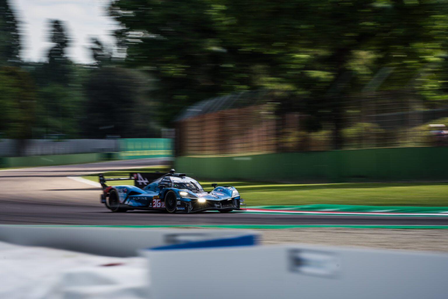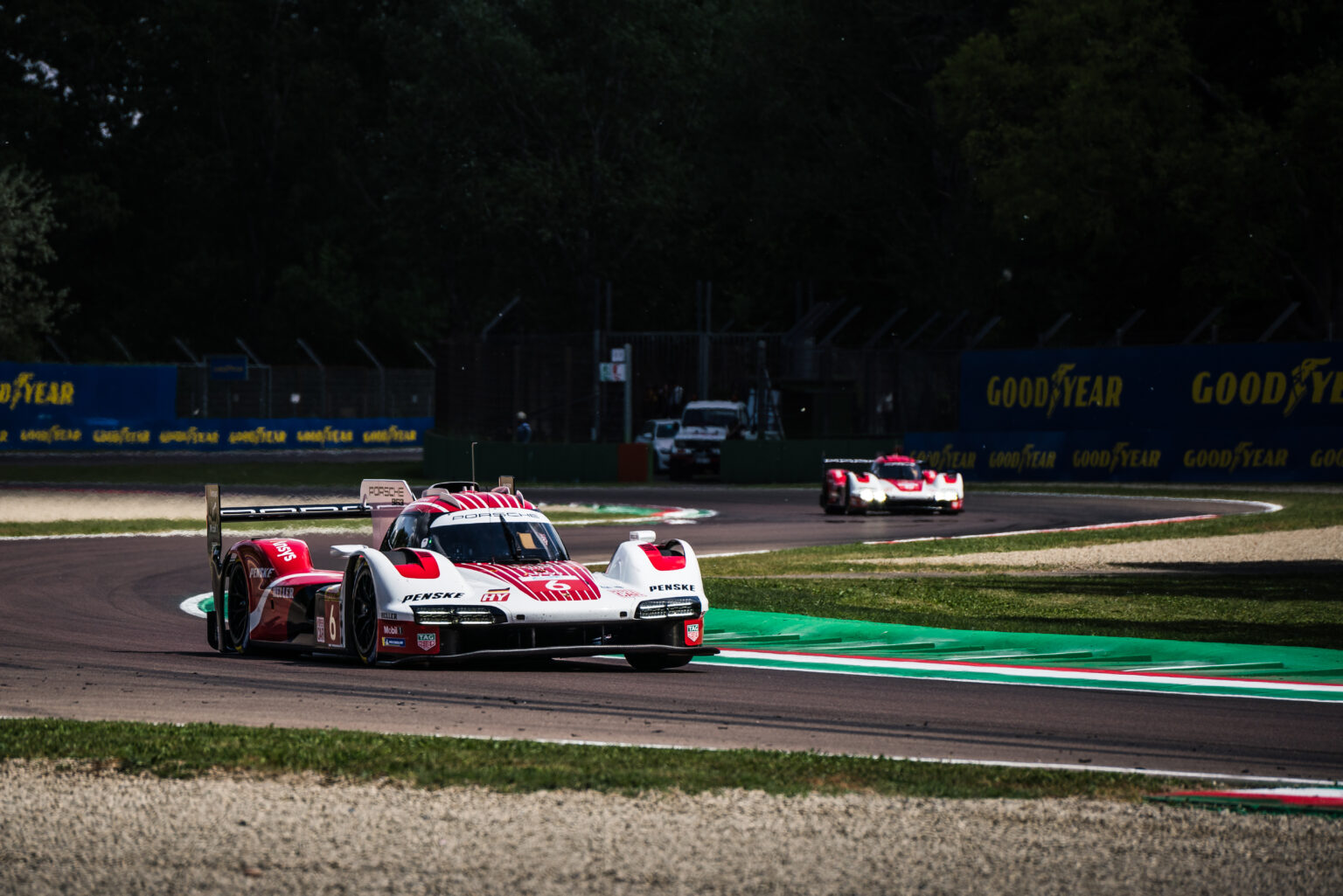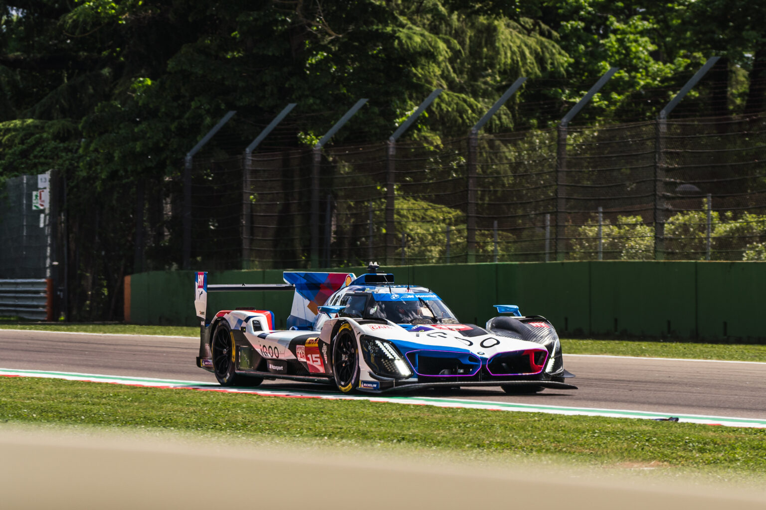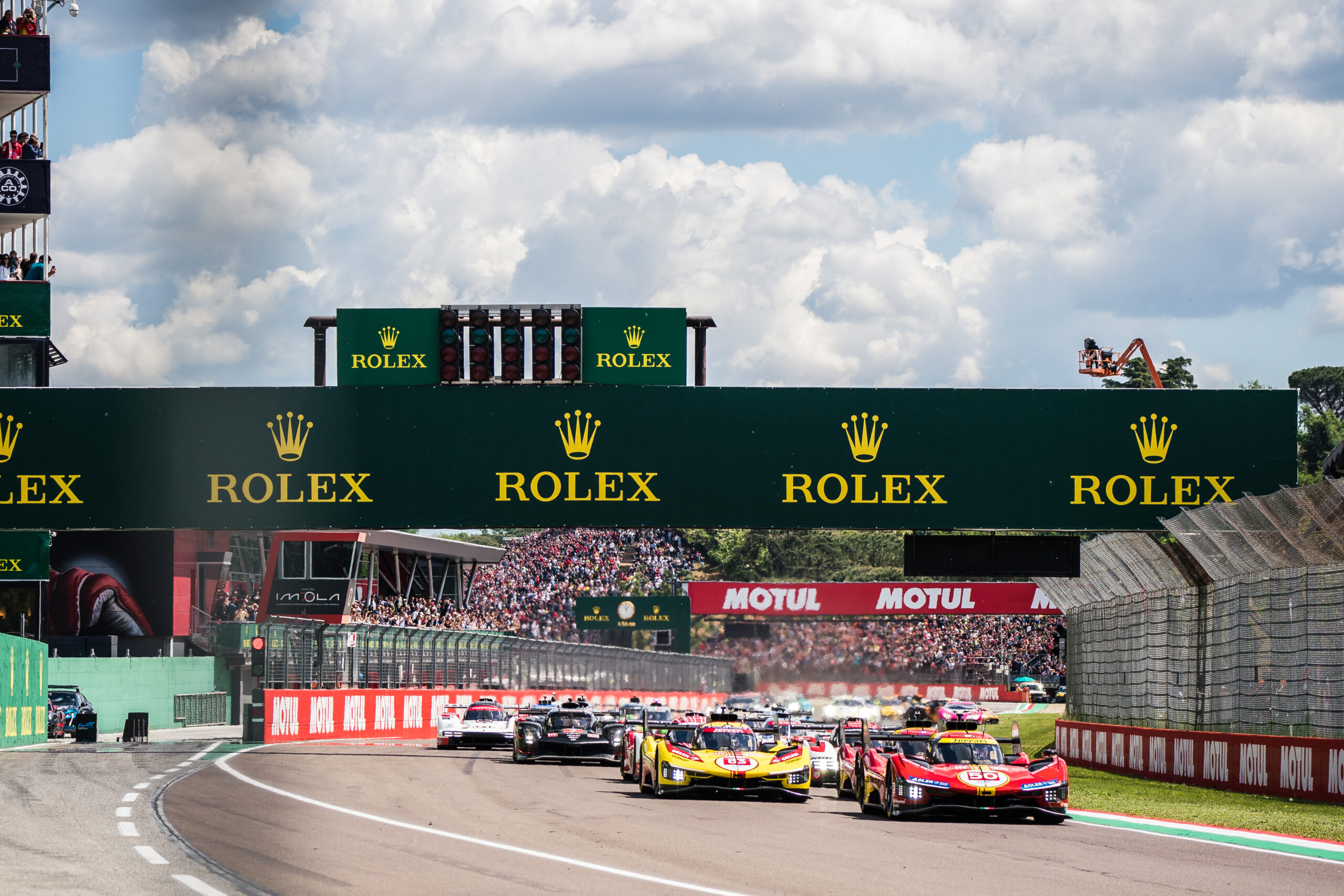 Three race cars navigate a corner at the Imola Circuit, passing DHL banners