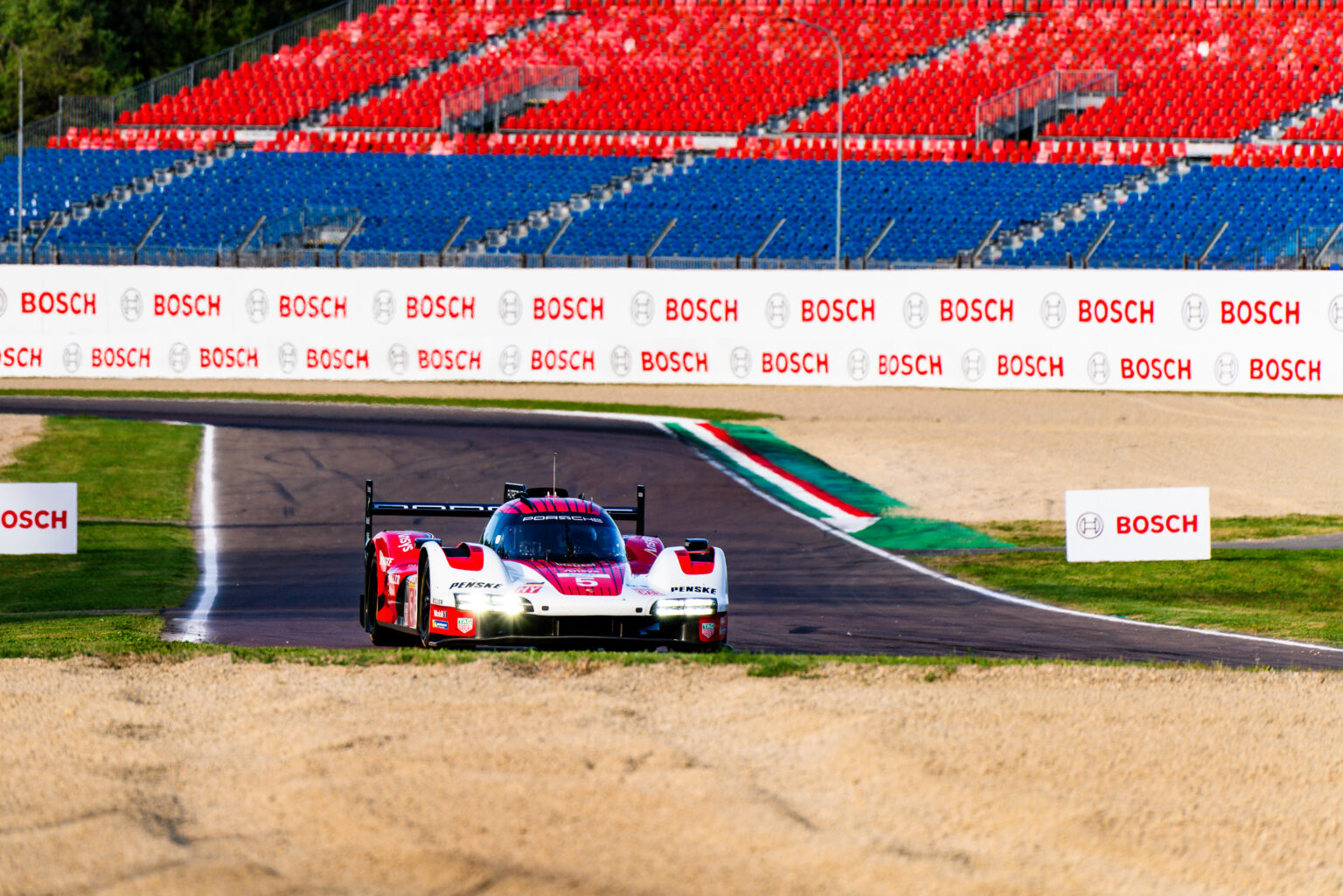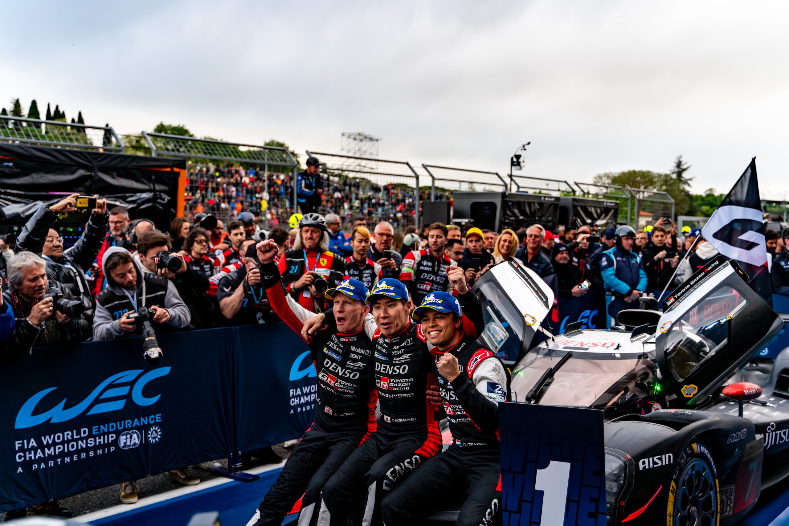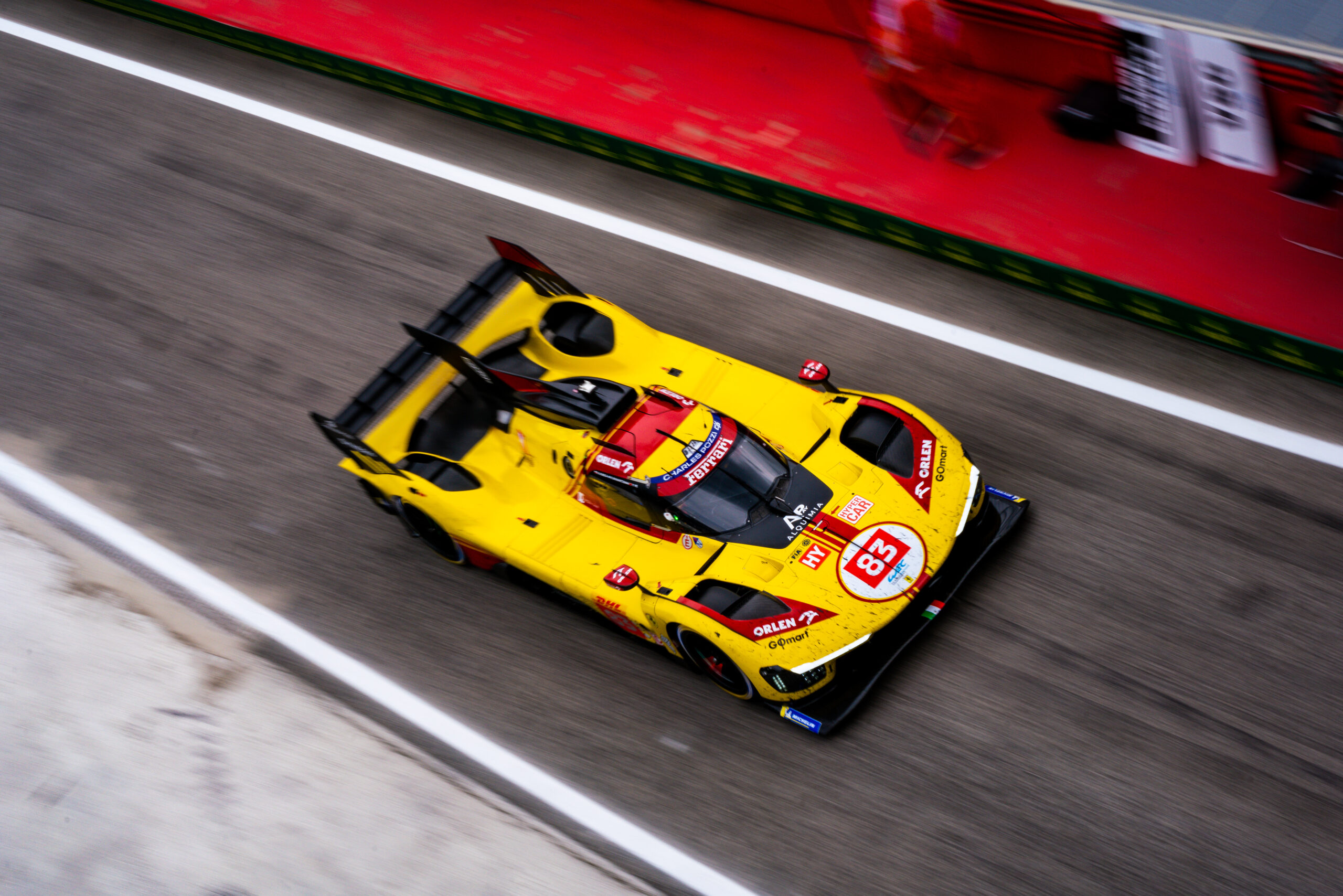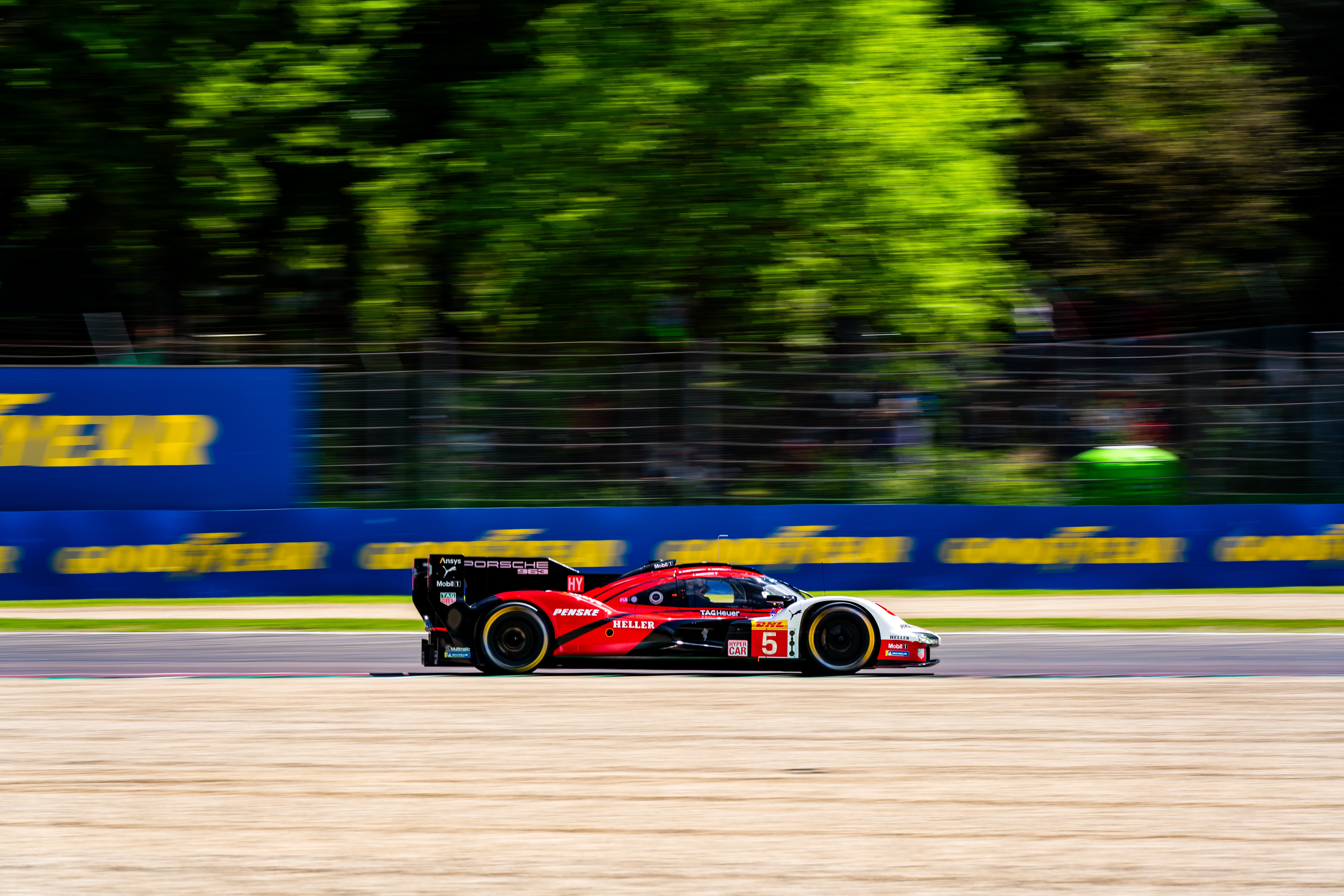 Three race cars navigate a corner at the Imola Circuit, passing DHL banners