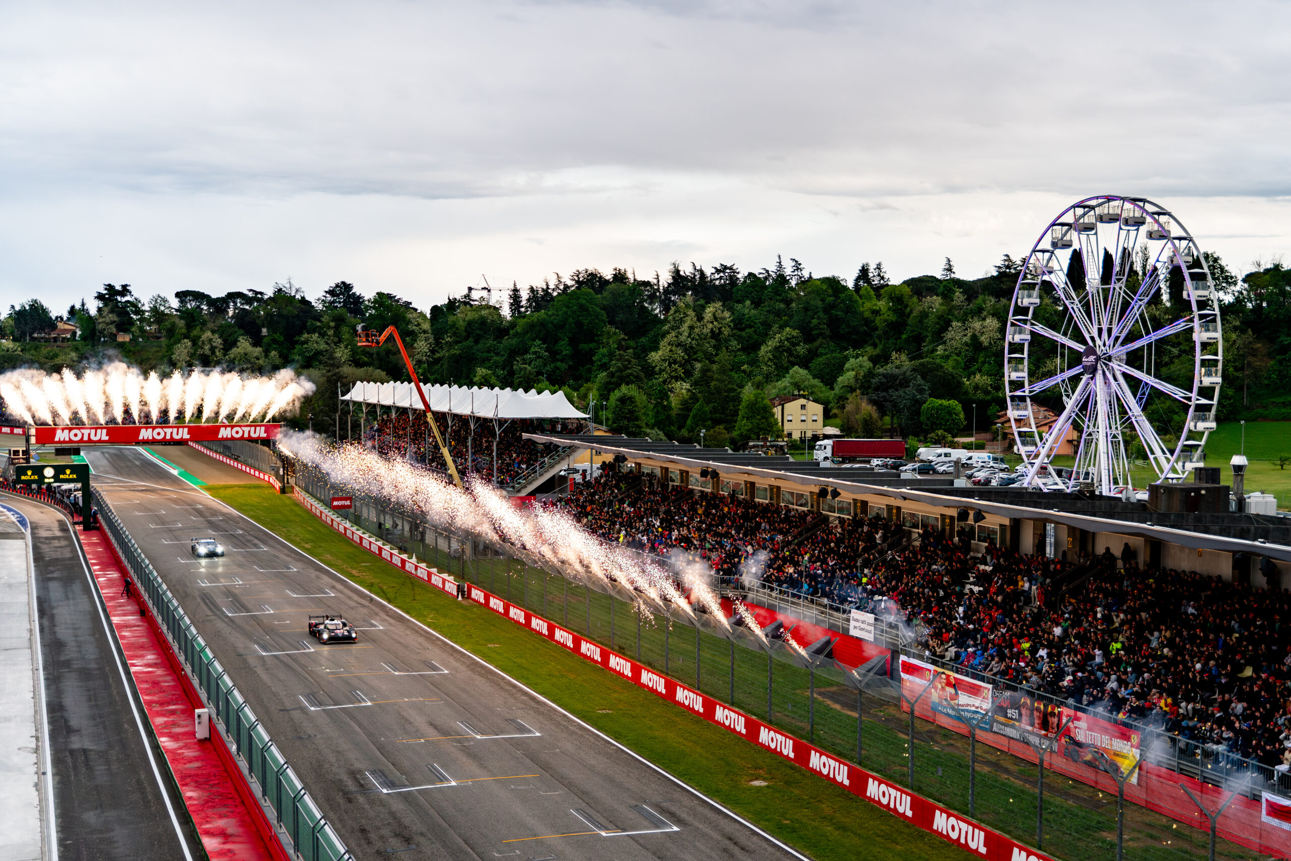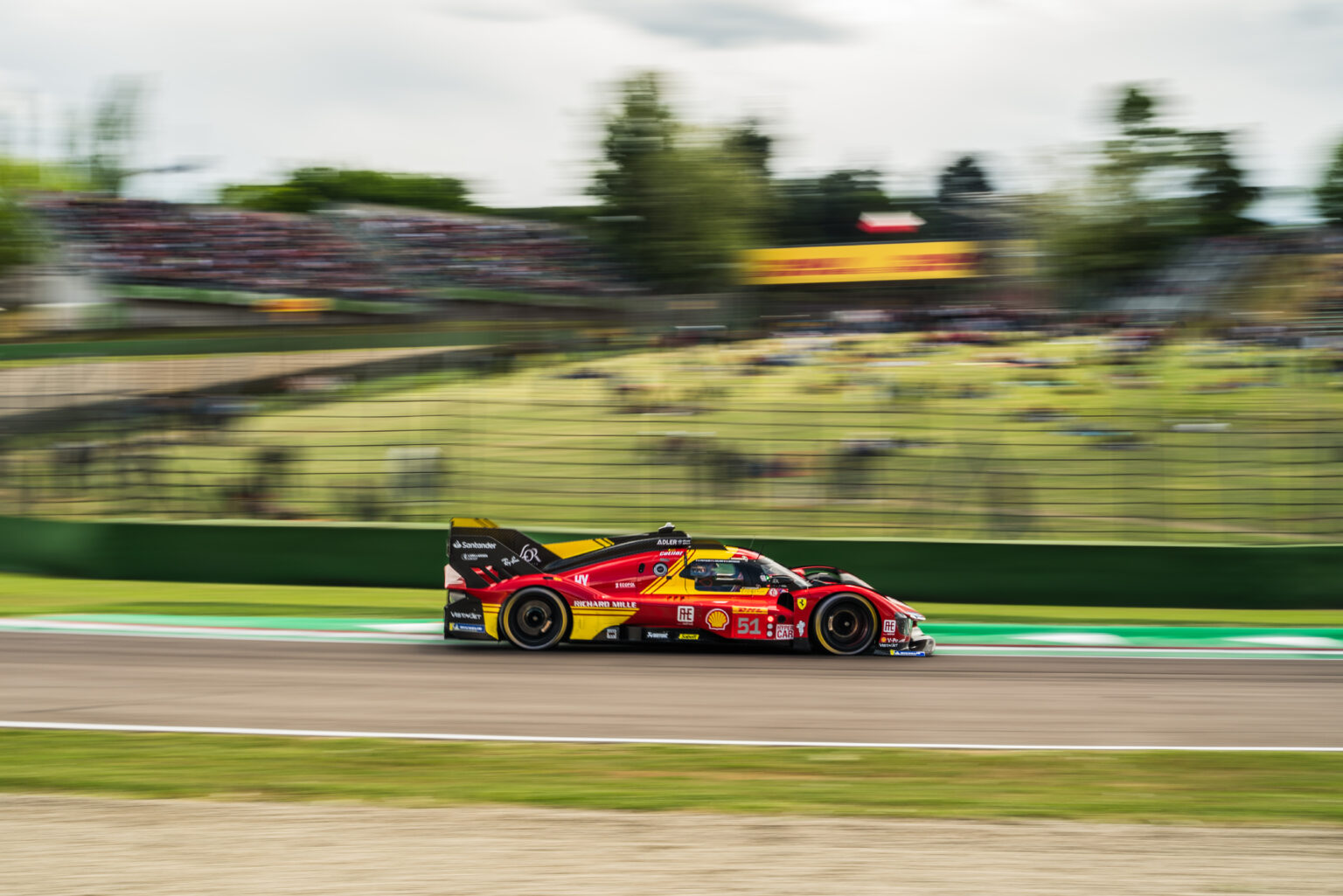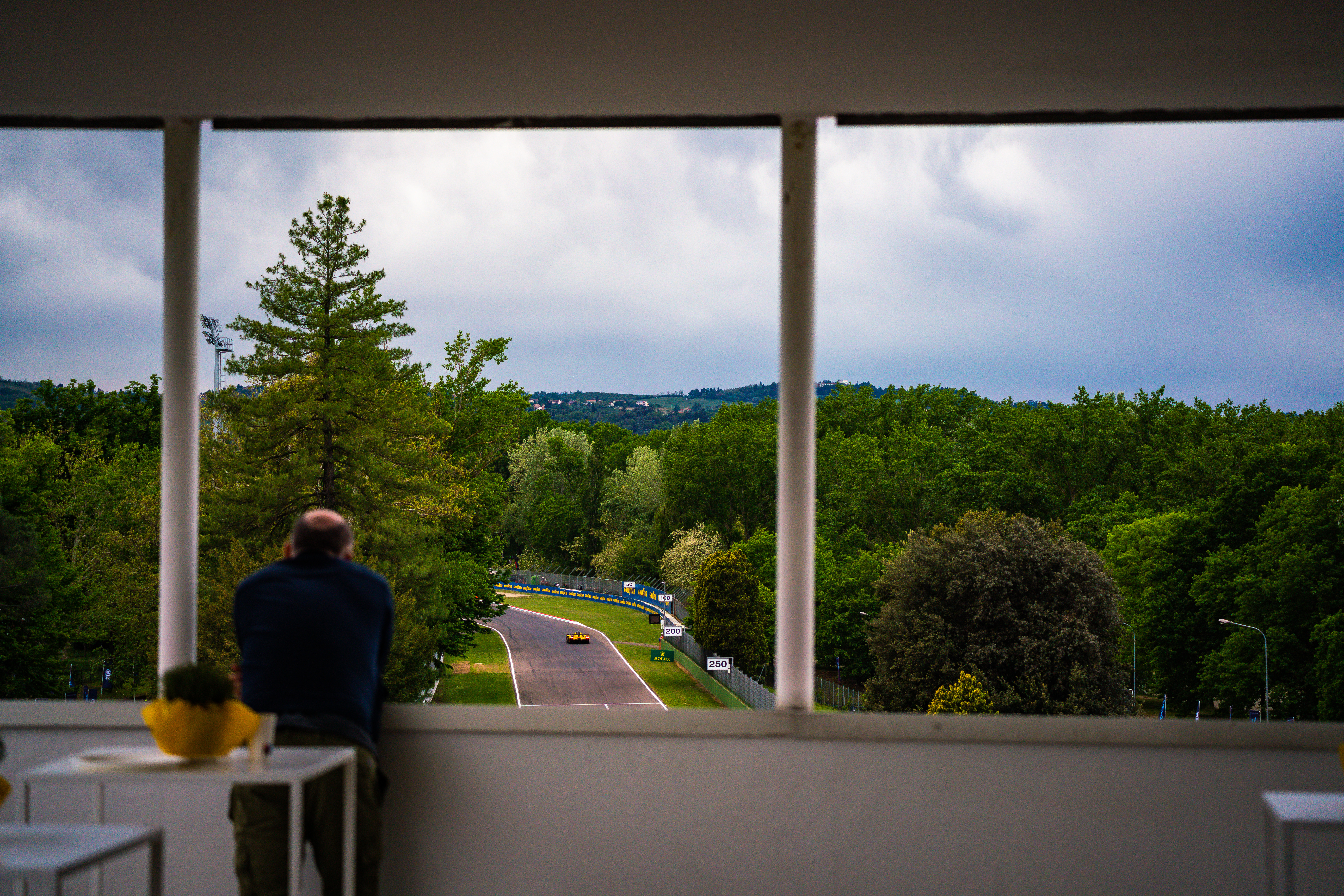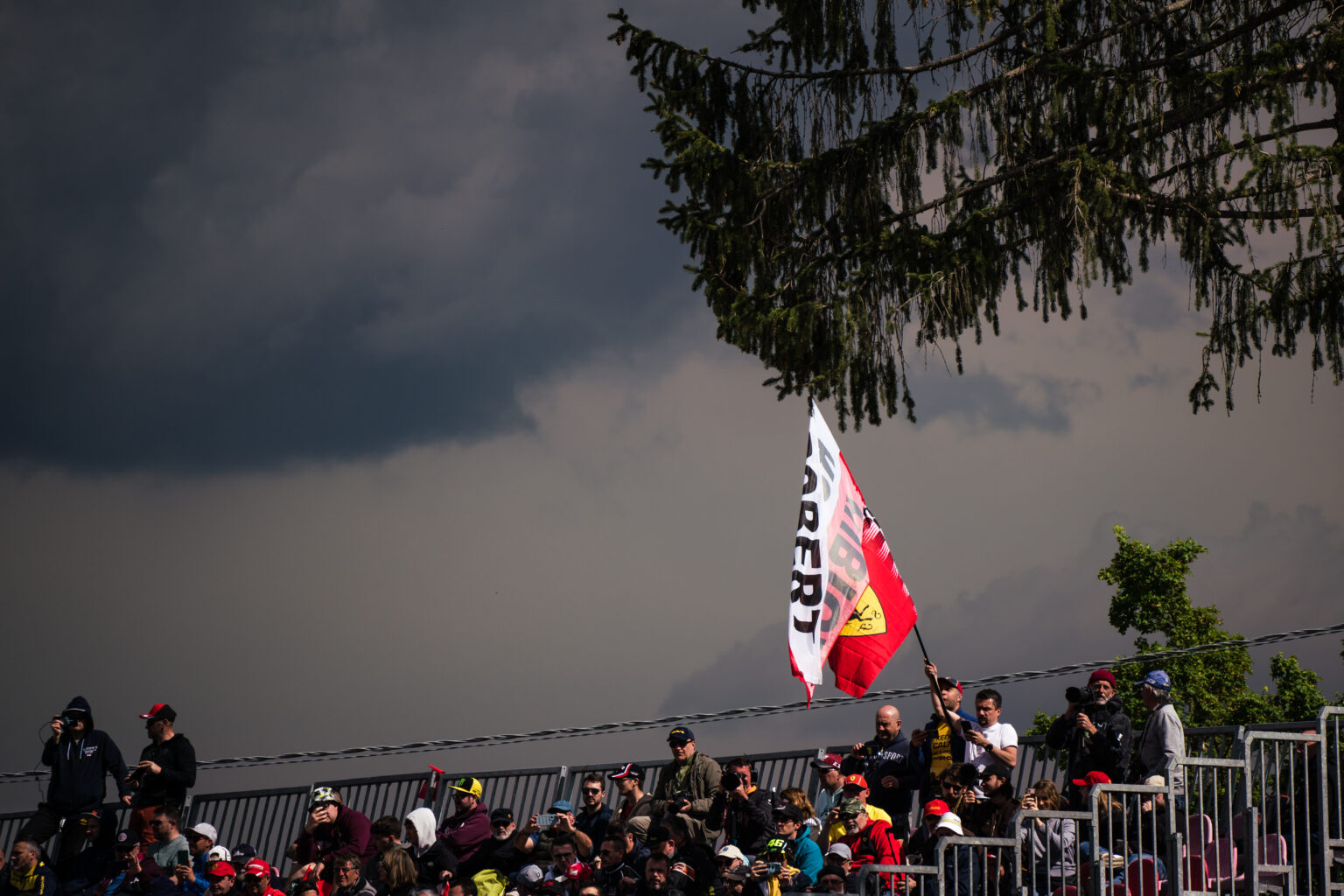 Ferrari flag waves high above fans at the Imola Circuit during a race